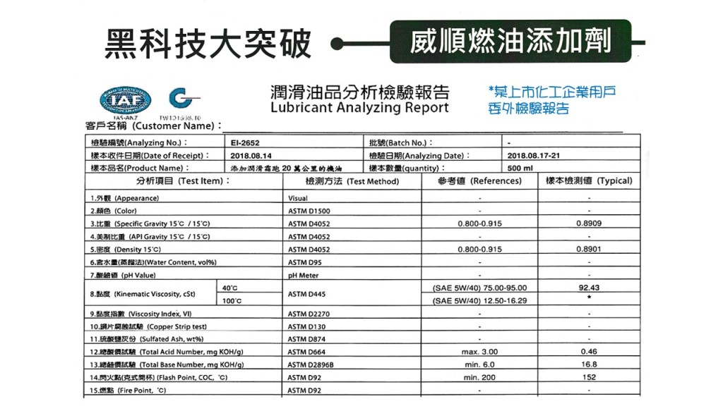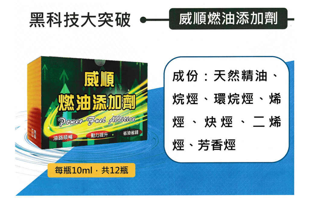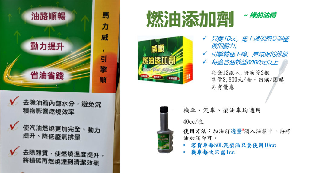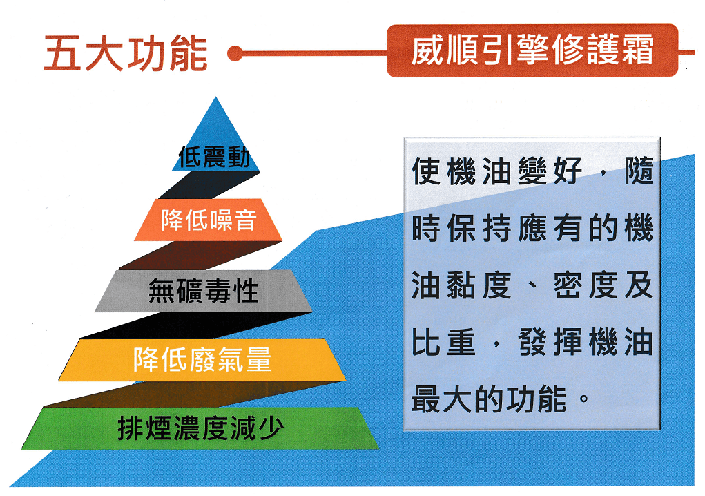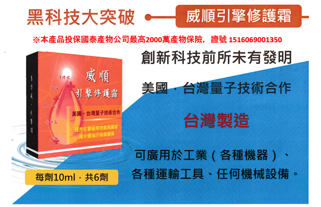 台灣人發明、台灣製的環保黑科技要顛覆你的觀念,提供你環保而且更優質的引擎維護妙方,不僅有知名股票上市企業所做的檢驗報告,還有國泰產物公司認可兩千萬產物保險。加入後三分鐘您將驚訝引擎聲音與轉速的變化,感受威順引擎修護霜開始您的愛車注入全新活力,體驗駕馭的輕盈與愉悅!