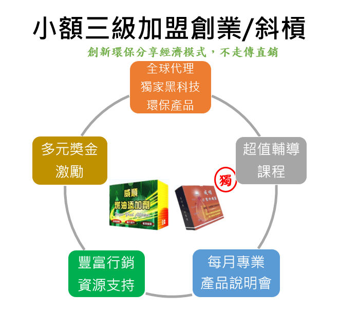 歡迎認同我們理念與產品的消費者變成加盟商,一起推廣更環保事業進而創富。兆沅國際是全球獨家總代理,建立創新的加盟商系統,給予加盟商豐富的行銷及培訓資源,及多元獎金支持,讓您無壓力加盟,輕鬆分享體驗式經營。