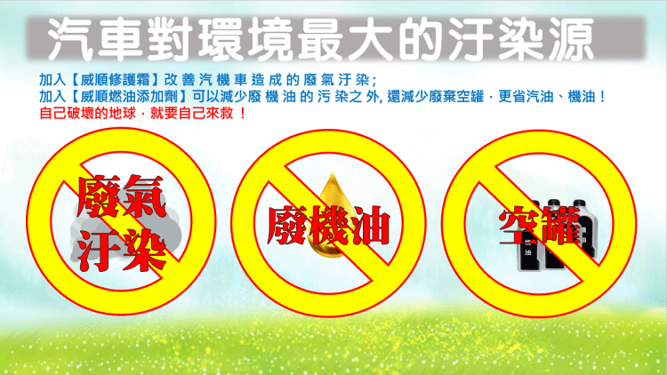 掌握未來車輛保養趨勢,全新威順引擎修護霜(環保還原替代機油),革命性替代機油!遠離廢棄的空罐,告別排廢油的困擾,實現環保駕馭!