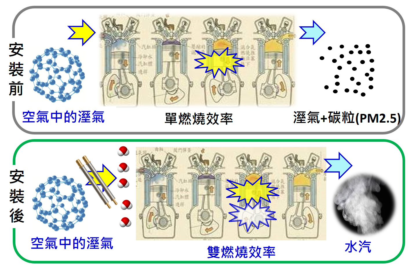 將引擎運轉燃燒時所需要的空氣中的水分子細化以抓附油滴,增加油分子與空氣接觸面積,來幫助引擎作更有效率的燃燒、運轉。並消除水滴殘留會引起引擎生銹的問題。