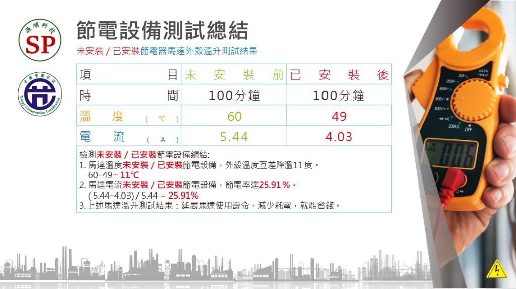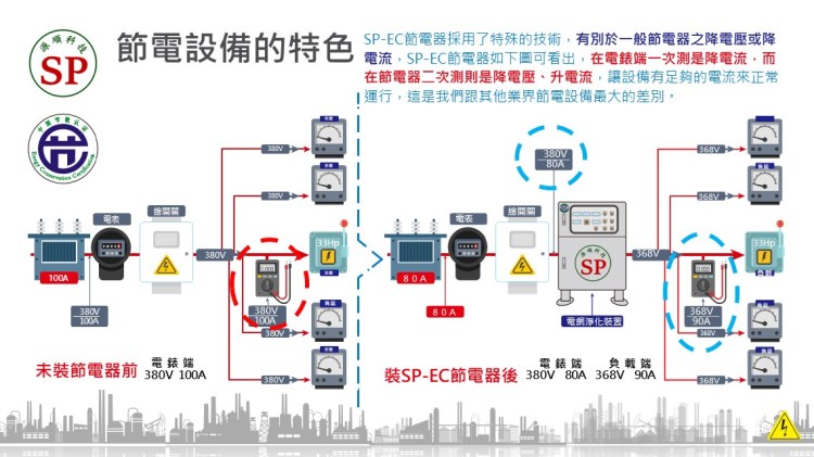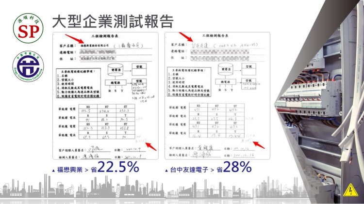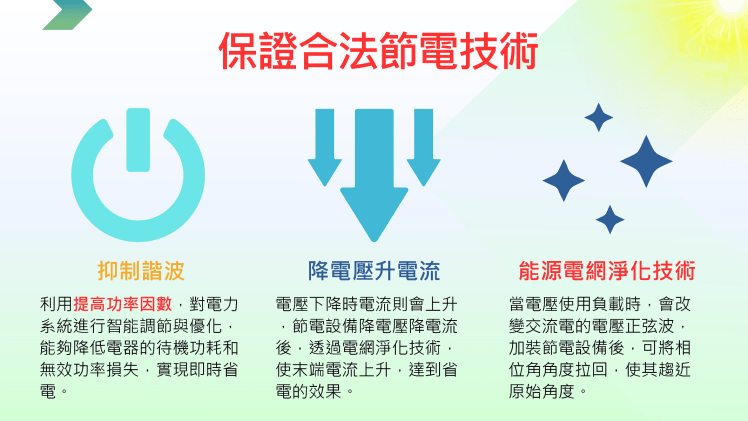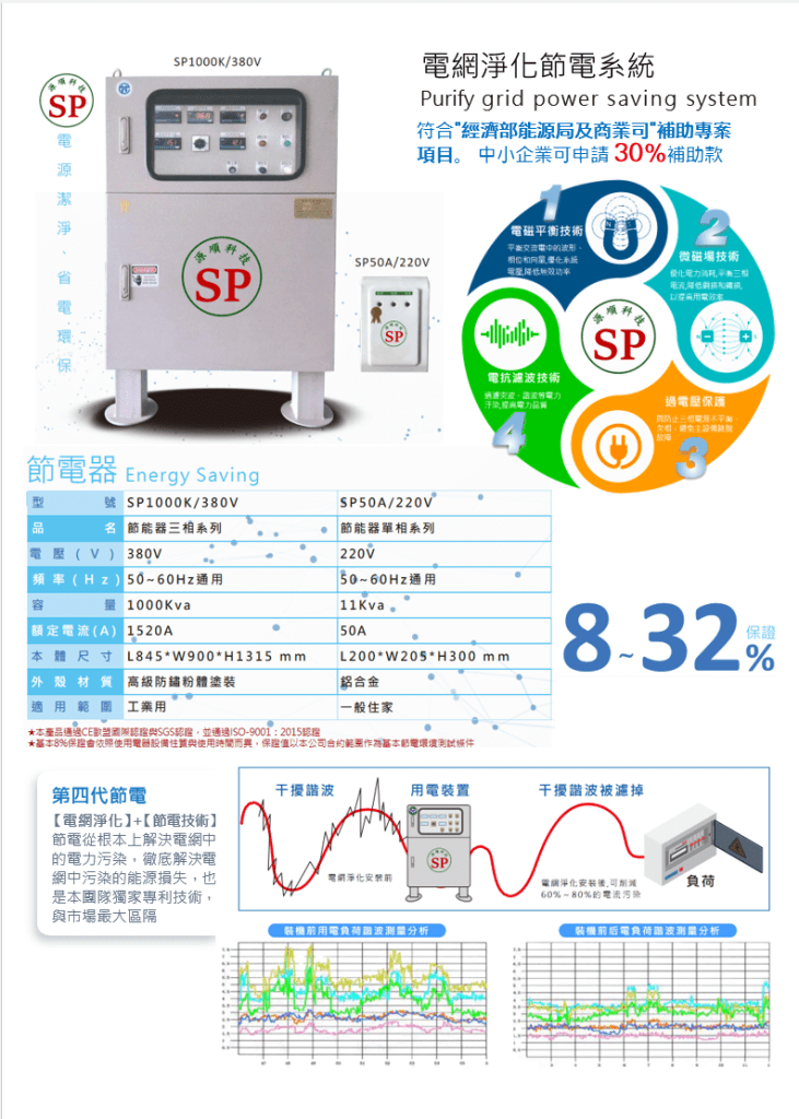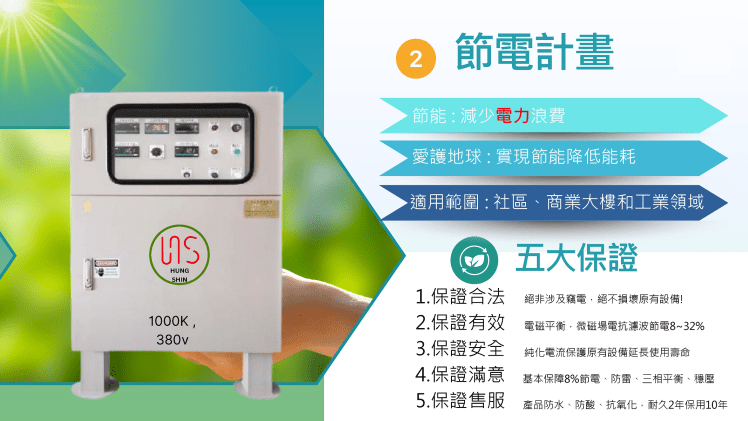 節電器具有純化電流輛入廠區供電的功能,反具有保護電氣設備、延長使用壽命的功能,一舉多得; 另投保富邦產物之五千萬產品責任險,對使用者更有保障。